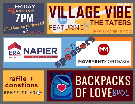Napier REALTORS® ERA is excited to join with Movement Mortgage in sponsoring one of the Village Vibe events for 2018. Our event takes place on Friday, June 15th from 7-10pm… which also happens to be the 'LAST DAY OF SCHOOL' thus a great reason to come out and celebrate!!! The event is located at 3920 Marion Harland Lane in Powhatan and takes place rain or shine, so be sure to bring an umbrella if the weather looks questionable, and a chair for comfort.